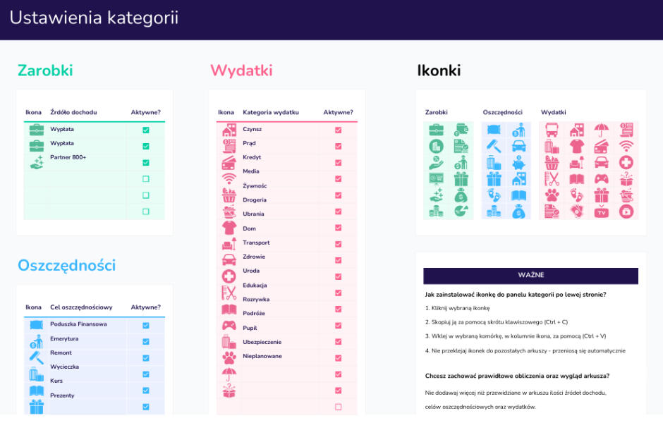 wpisujesz własne kategorie zarobków, wydatków i oszczędności