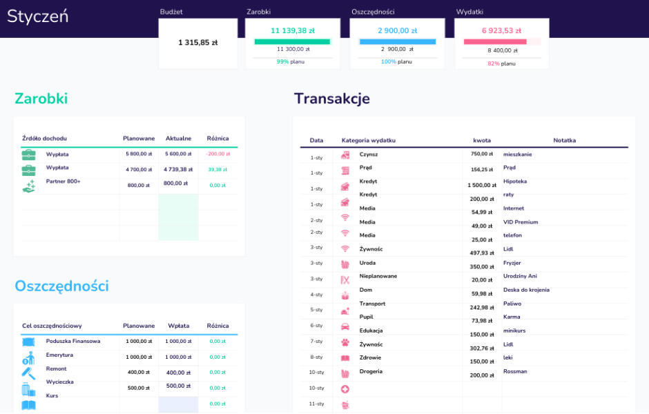 Planer pokazuje też procent realizacji zarobków, wydatków i oszczędności. Dzięki temu wiesz, gdzie jesteś, bez liczenia w głowie.